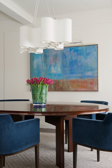 编辑点评:洁白的吊灯,充满色彩艺术感的大幅油画,深蓝色的座椅,恰当地在圆形餐桌上摆上一瓶红色郁金香,多色辉映,在整体白色调的餐厅里,显得和谐而温馨。
