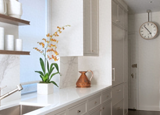 编辑点评:在一袭白色的厨房里,一绿盆栽显得格外亮眼,而整体橱柜全方位的收纳柜设计,足以说明主人是一个乐于下厨的“吃货”本色。