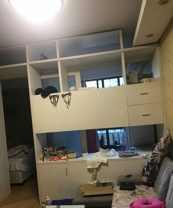 ▲未改造之前的原图,开间光线本身不好,采用各种收纳柜遮挡,遮挡空间更小,光线更暗