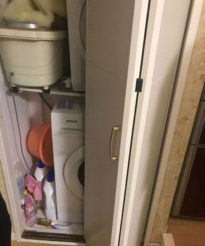 ▲卫生间门口利用过道做了干区布置,同时满足了洗衣机的放置,空间合理利用