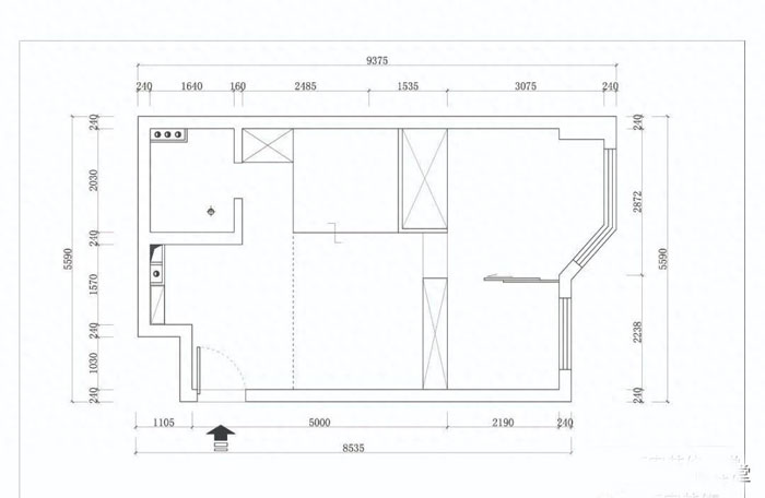 房子的原始结构图纸,进门就是没有封闭的厨房,原始公寓本身就是开放厨房,紧邻就是很小的卫生间,其他彻底开放,原房东直接在卫生间对面放床,用隔断柜分割空间,导致进门光线整体没有,而分割的另一边因为有窗户,光线非常好,也就是布局彻底是错误的做法.