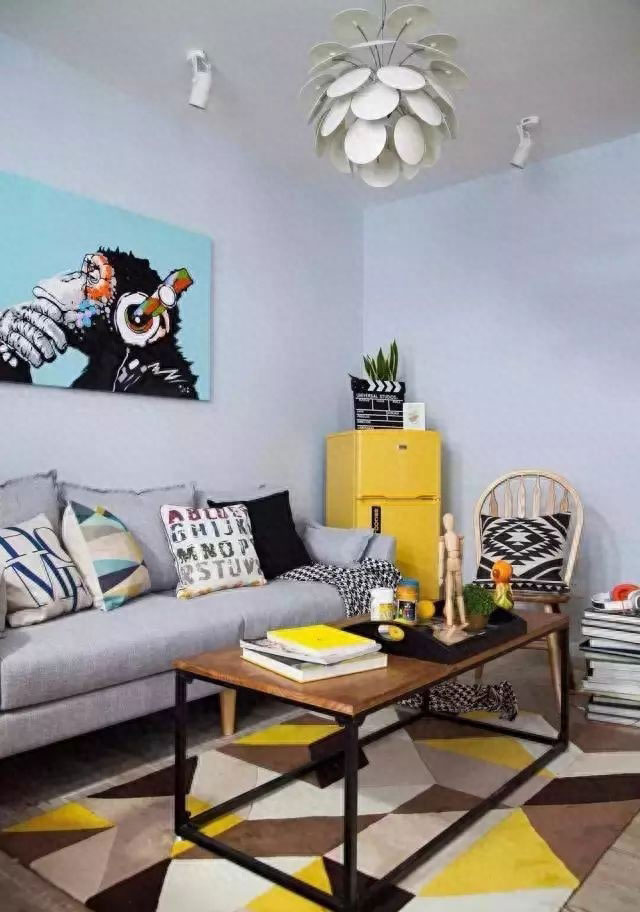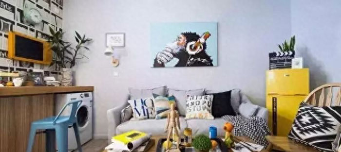 别看屋子比较小,冰箱,沙发,洗衣机,餐厅吧台都齐全了,一幅简单的漫画就让客厅充满生活气息。