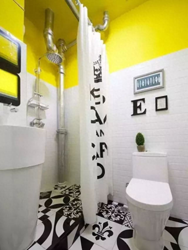 卫生间本身就小,所以就没有包管设计,不过这样刷上银色的金属漆,搭配白色和黑白花砖,整体配上白色的卫浴,效果也是挺敞亮的不是?