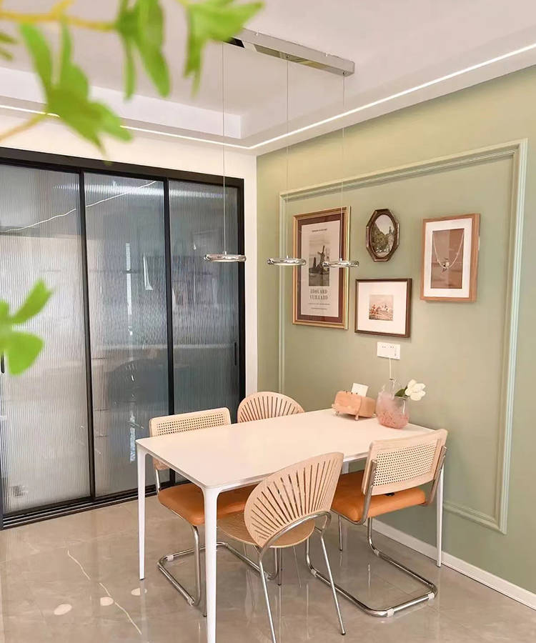 4、餐厅背景用石膏线简单的勾勒出美式线条感配上木质相框,氛围感极佳。